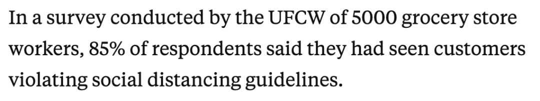在UFCW的一项5000名超市与杂货店员工参与的调查显示,在超市里有85%的顾客并没有遵守“社交远离”政策。